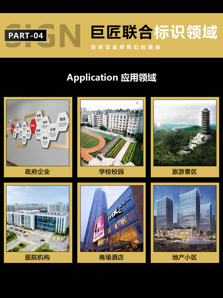 巨匠聯(lián)合標(biāo)識主要承接全國政府、企業(yè)、學(xué)校、商場、醫(yī)院、公園景區(qū)等全方面綜合型標(biāo)識標(biāo)牌工程項目。